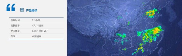 该产品采用本公司自主研发的高频短时临近外推模式,结合国家气象观测站网200+雷达观测数据,实现了对短时未来这一时间降水气象条件的精准预测,相比传统气象降水预报产品,其精准度有十分可观的提升。